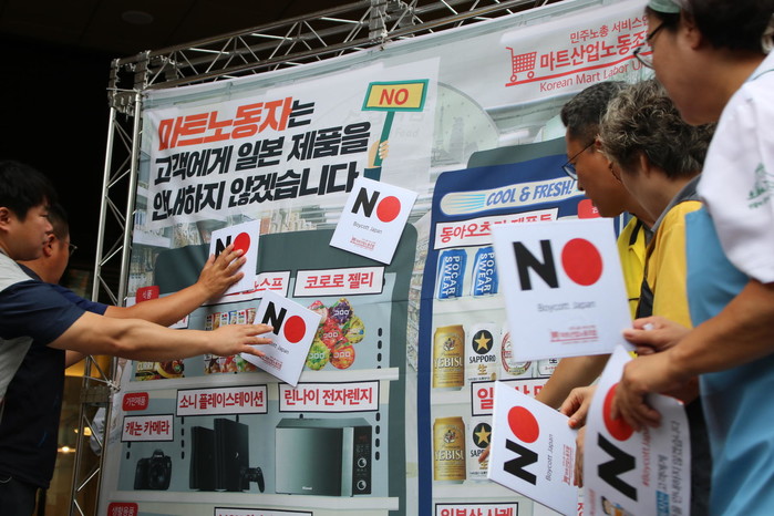 앞서 마트노조는 지난 7월 24일 국내 대형마트 3사와 중소마트 직원들이 일본제품 안내 거부 행동에 돌입하겠다고 발표한 바 있다.