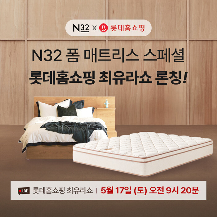 [일요주간 = 노현주 기자] 하이엔드 폼 매트리스 브랜드 ‘N32’가 17일 롯데홈쇼핑 대표 프로그램 ‘최유라쇼’를 통해 TV홈쇼핑에 공식 데뷔한다. 국내 프리미엄 폼 매트리스 시장에서 빠르게 입지를 굳힌 N32는 홈쇼핑 채널을 통해 소비자와의 접점을 확대한다는 계획이다.