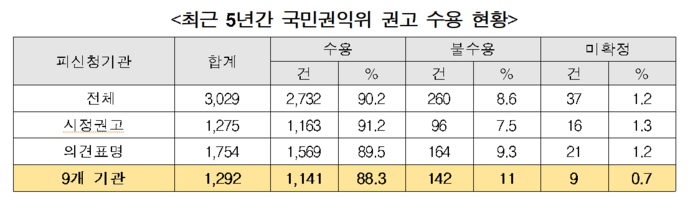 권익위는 2013년부터 2018년 9월까지 총 3029건을 행정기관 등에 권고했고 이 중 90.2%인 2732건이 수용됐다. 행정기관 등이 받아들이지 않은 권고는 8.6%인 260건이었다.