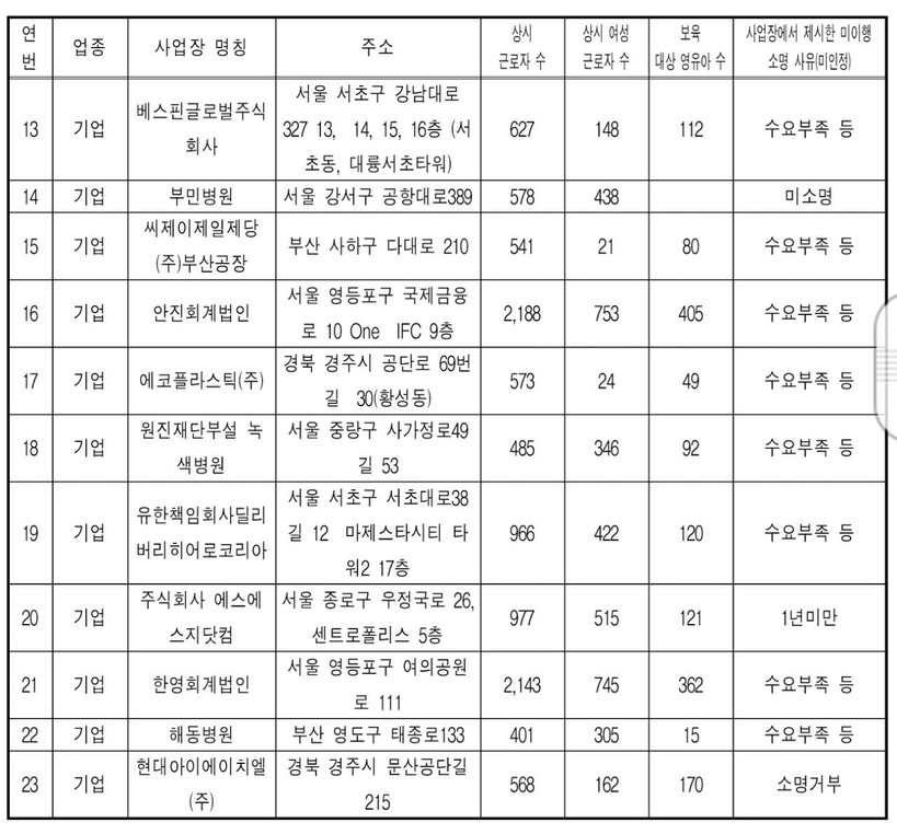 <직장어린이집 설치의무 미이행 사업자 명단 23개소>