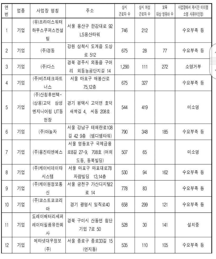 각 홈페이지에 공개된 명단은 ‘2020년 직장어린이집 설치 의무이행 실태조사’ 결과에 따라 올렸다.
