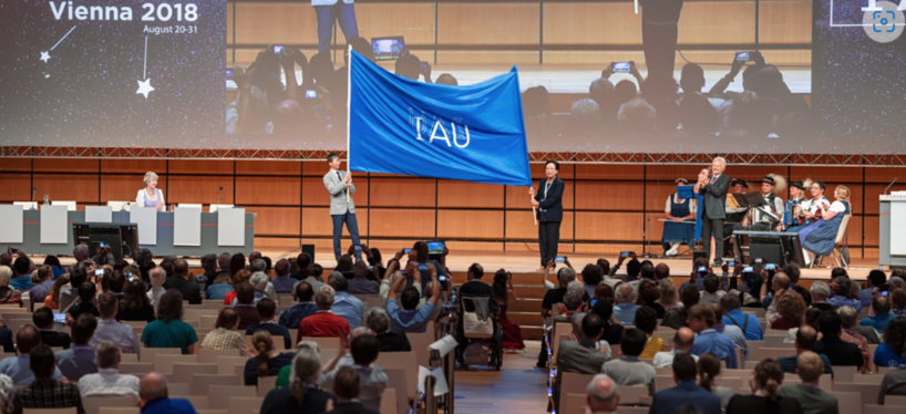 ▲2018년 비엔나에서 개최된 제30차 IAU 총회에서 대회기를 이양 받는 강혜성 교수(조직위원장)와 박명구 교수(한국천문학회장)의 모습.(사진=과학기술정보통신부) |