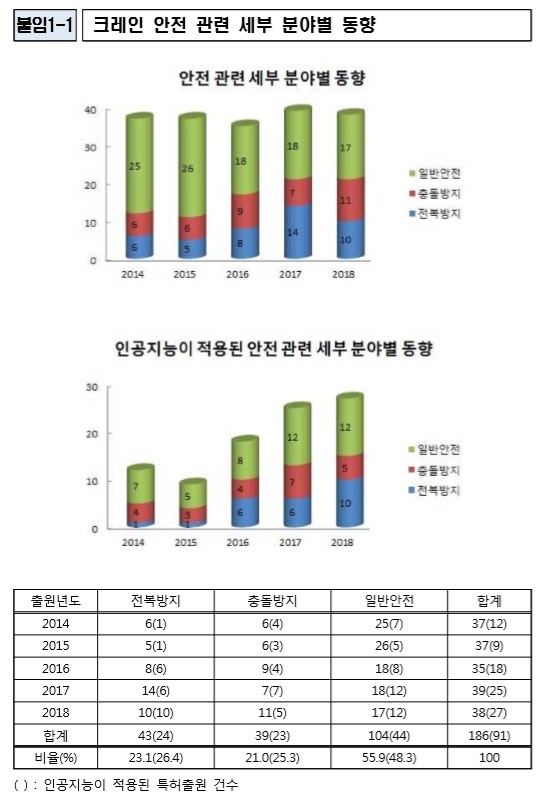 인공지능 기술이 적용된 안전 관련 출원의 경우 꾸준히 증가해 전체 안전 관련 출원의 49%(91건)를 차지했고 특히 중대재해와 직접 관련이 있는 크레인의 전복과 충돌 방지 기술에 인공지능이 적용된 출원이 전체의 51.7%(47건)를 차지했다.