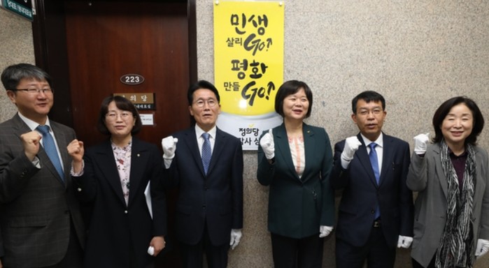 ▲ 사진은 지난해 10월 8일 오전 서울 여의도 국회에서 열린 정의당 국정감사 상황실 현판식에서 이정미 당시 대표(왼쪽에서 네번째) 등 지도부가 기념촬영하고 있는 모습.ⓒnewsis |