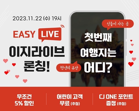 여행이지는 오는 22일 오후 7시 이지라이브 첫 방송을 통해 고객들을 찾아간다. 이지라이브 방송은 여행이지 홈페이지를 통해 라이브로 시청할 수 있다.
