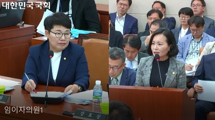 ▲ 지난 10일 국회 환경노동위원회 국정감사에서도 임이자 의원(좌측)이 면봉산풍력사업의 문제점을 질의하고 정미진 청송군의원(우측)이 답변하는 모습. |