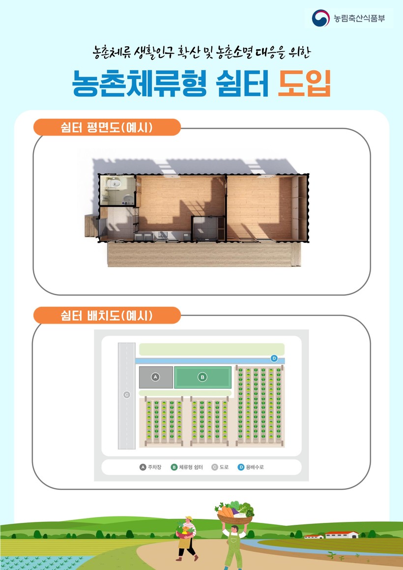 농촌체류형 쉼터는 도시민의 주말·체험 영농 및 농업인의 경영 지원을 위해 한 세대당 설치하는 연면적 33㎡ 이하의 가설건축물 형태의 임시숙소로, 농지전용 허가 없이 설치할 수 있다. 다만, 방재지구, 자연재해위험지구, 붕괴위험지역, 개발제한구역, 자연공원, 상수원보호구역 등 개별법률에 따라 설치가 제한되는 지역에는 조성할 수 없다.