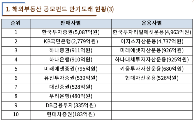 오는 10일 시작되는 국정감사를 앞두고 국회 정무위원회 소속 국민의힘 윤창현 의원이 금융감독원으로부터 제출받은 해외부동산 공모펀드 판매현황 자료에 따르면 2018년 이후 총 14개 펀드의 판매액은 1조 2757억 원이며 수익자 수(개인·법인)는 2만 7568명이다. 이중 개인이 2만 7187명(투자금액 1조 478억 원), 법인이 381개(투자금액 2279억 원)으로 나타났다.