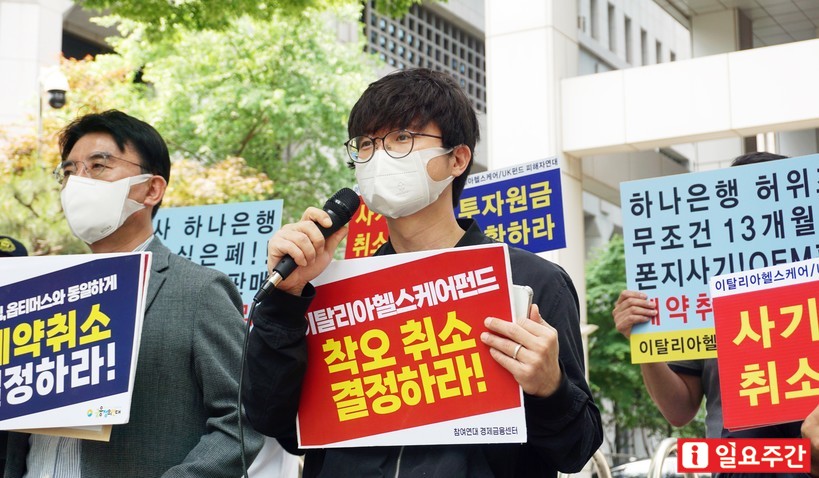 19일 경제정의실천시민연합, 금융정의연대 등은 서울 영등포구 금융감독원 앞에서 기자회견을 열고 이탈리아 헬스케어 펀드의 사기성을 근거로 금감원은 ‘착오에 의한 계약취소’ 결정을 내려야 한다고 주장했다.