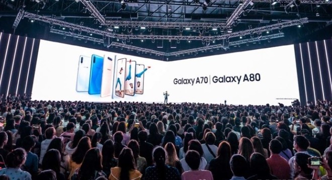 ▲ 지난 4월 10일(현지시각) 태국 방콕에서 진행된 'A 갤럭시 이벤트' 참석자들이 '갤럭시 A80'와 '갤럭시 A70'를 소개하고 있다.(사진=삼성전자 제공) |