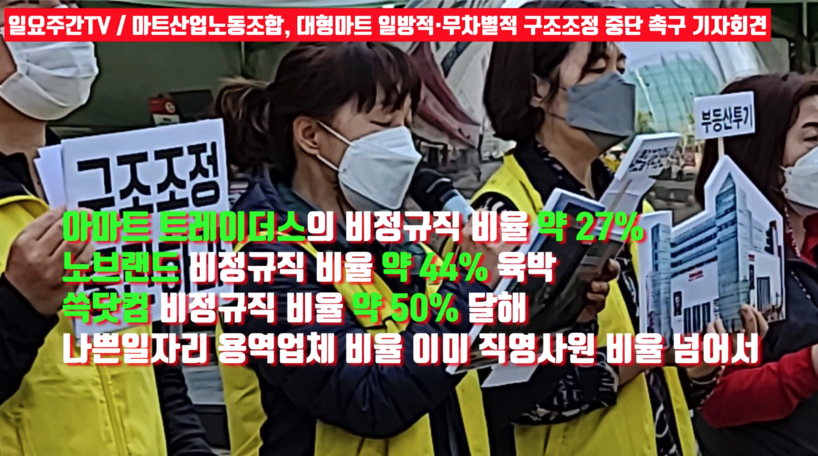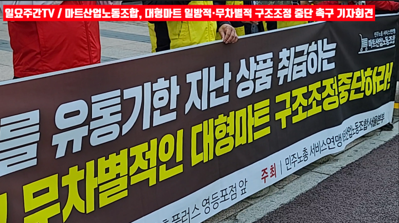 [일요주간TV/영상 편집 = 김상영 기자] “코로나19 이후 이마트, 홈플러스, 롯데마트는 매장 폐점과 인력 구조조정에 나서고 있다. 이 과정에서 마트노동자들을 유통기한이 지난 상품처럼 취급해 마트 직원들이 고용불안, 원거리발령을 걱정하는 목소리가 커지고 있다. 신규매장을 늘리면서 신규인력을 채용하지 않아 현장 노동강도는 지속적으로 증가하고 있다.”