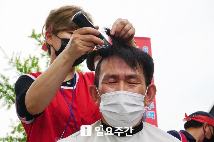 한편, 이날 집회에서는 최영준 비대위원장 외 11명의 삭발 투쟁도 이뤄졌다. 이들은 “조합원들의 억울함과 한스러움, 피맺힌 절규를 호소하기 위해 삭발을 결정했다”라고 설명했다.