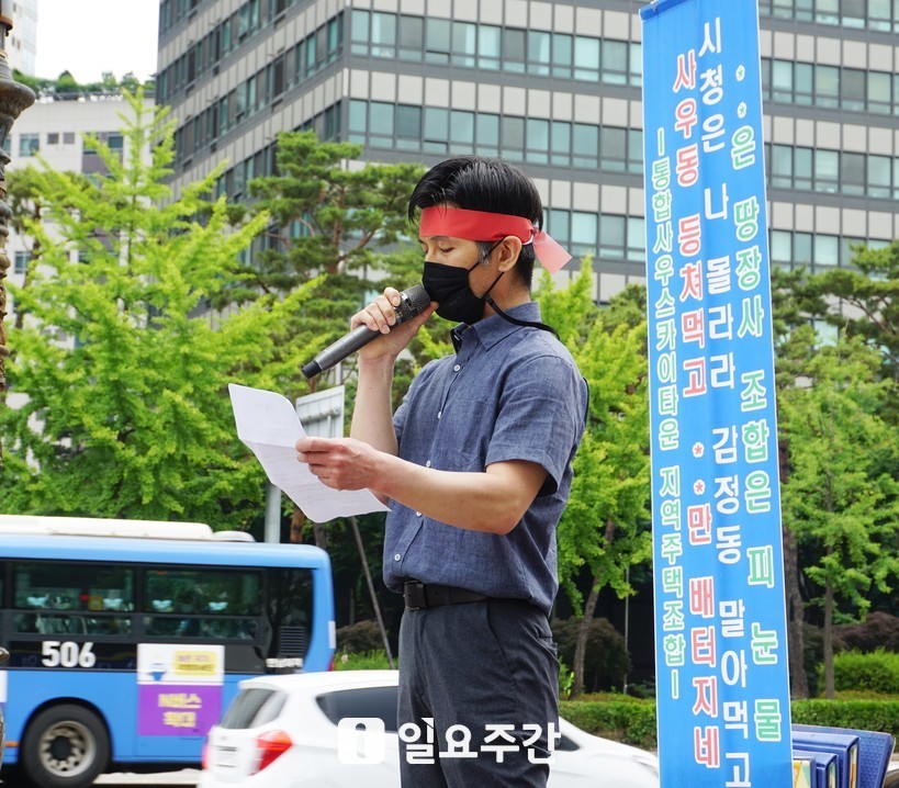 사우스카이지주택조합은 지난 8일 서울 용산구 삼각지역 11번 출구 인근에서 집회를 열고 전 업무대행사와 전 조합장에 대한 수사 및 처벌을 관할 행정당국에 요구했다. 이날 집회에 참석한 조합원은 약 300여 명(주최 측 추산)으로 집계됐다. 이들은 각자 머리에 붉은 띠를 동여매고 자신들의 요구사항이 적힌 손팻말을 든 모습이었다.