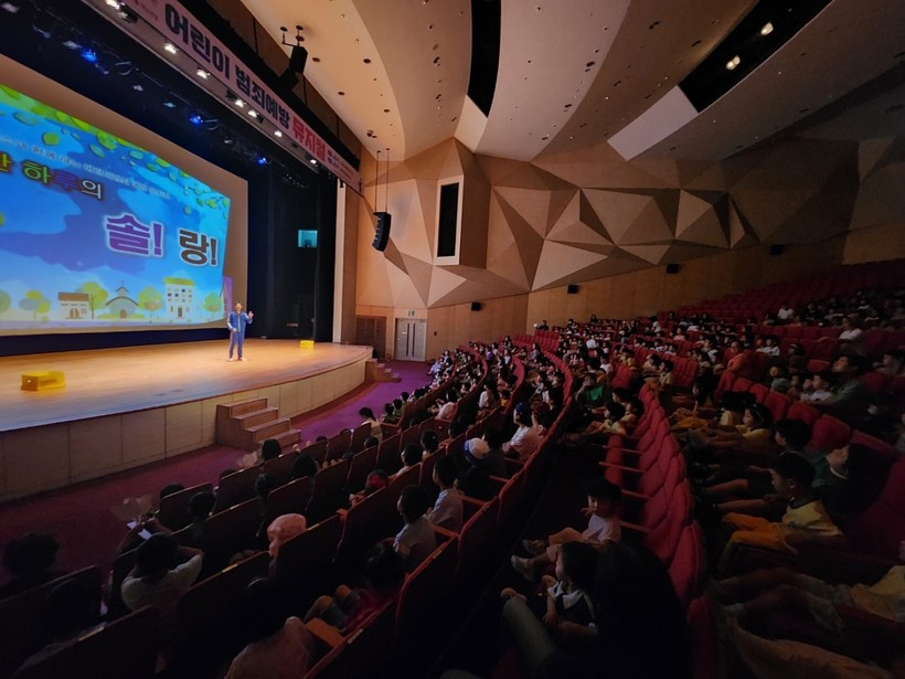 ▲ 범죄예방뮤지컬 이미지 1부 (2024년 6월 전남 강진군 강진아트홀에서 진행된 범죄예방뮤지컬에 참여한 어린이와 학부모들이 공연을 관람하고 있다). (사진=새마을금고중앙회 제공) |