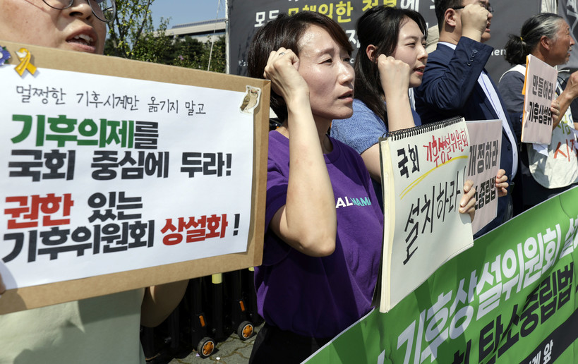 ▲ 기후위기비상행동 기후정치위원회가 지난 4일 서울 여의도 국회 앞에서 기후상설위원회, 탄소중립법 개정 촉구 기자회견을 하고 있다. (사진=newsis) |