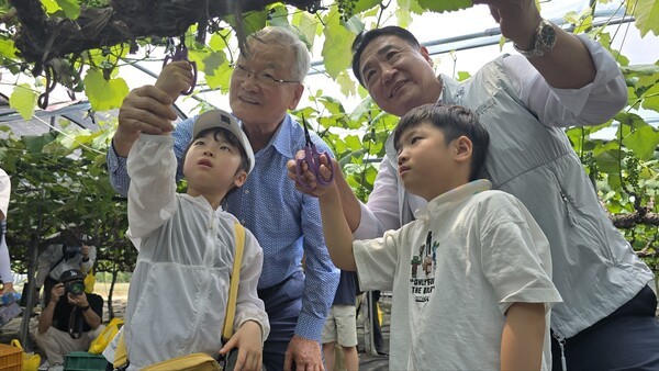 ▲ 윤영달 크라운해태제과 회장(좌)과 정영철 영동군수(우)가 임직원 가족 자녀들과 포도 알솎기 체험을 하고있다. (사진=크라운해태제과 제공) |