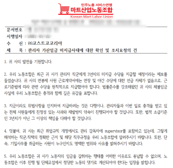 9일 마트산업노동조합 코스트코지회 (이하 노조)는 “코스트크가 최근 관리자직군에 대한 미지급 수당을 지급한다는 복수의 제보를 접수했다”며 “회사는 공식적으로 정확한 지급사항과 이유를 확인해주고 있지 않지만 공문 회신으로 ‘수당지급건’이란 사실임을 확인했다”고 밝혔다.