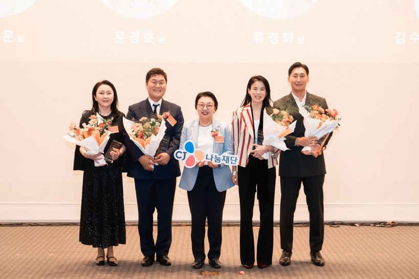▲ 민희경 CJ사회공헌추진단장(중간)이 (왼쪽부터) 배우 김나운님, 윤경호님, CJ도너스캠프 아카데미 마스터 멘토 류경화님, 우수 일반기부자 김수호님에게 감사패를 전달하고 기념사진을 촬영하고 있다. (사진=CJ그룹 제공) |