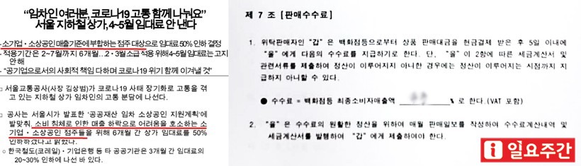 ▲(왼)서울교통공사가 2020년 상반기 배포한 보도자료 내용 중 일부. 소기업 및 소상공인 매출 기준에 부합하는 점주를 대상으로 진행하는 지원 정책이라고 설명하고 있다. (오)네이처리퍼블릭 A, B 점포를 중간관리 거래계약을 맺은 점주의 계약서 중 일부. 판매수수료 부분에 임대료 납입과 관련해 언급한 내용이 없다. <사진=각각 서울교통공사, 제보자 제공>