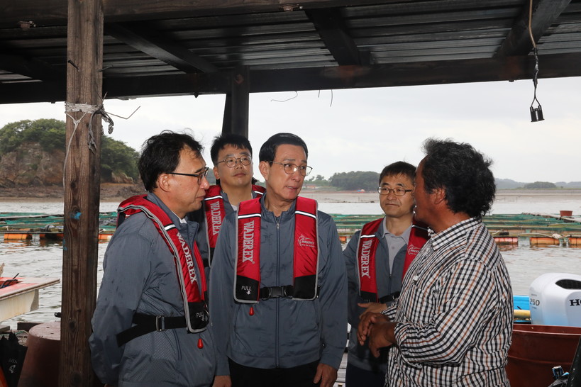 | ▲ 노동진 수협중앙회장(가운데)이 21일 안면도 천수만 양식장에서 양식 어업인으로부터 고수온 피해상황을 듣고 있다. (사진=수협 제공) |