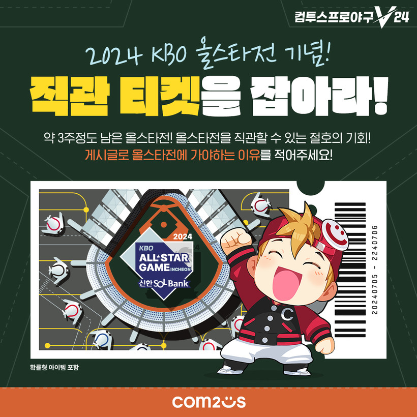 이번 이벤트는 ‘컴프야V24’ 공식 커뮤니티 이벤트 참여 게시판에 ‘KBO 올스타전’에 가야 하는 사연을 등록하면 참여할 수 있으며 당첨자에게는 7월 5일 열리는 ‘올스타전 프라이데이’와 6일 열리는 ‘올스타전’ 테이블석 또는 내야 지정석 티켓이 지급된다.