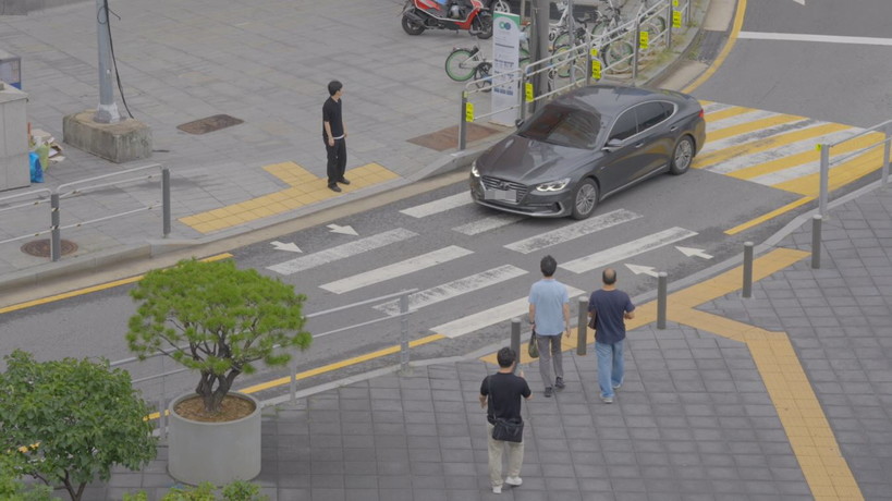 ▲ 횡단보도 손짓 캠페인 2차 실험 현장_횡단보도 앞에서 보행자가 손짓을 하지 않았을 때 일시정지하지 않고 지나가는 차량(사진=도로교통공단) |