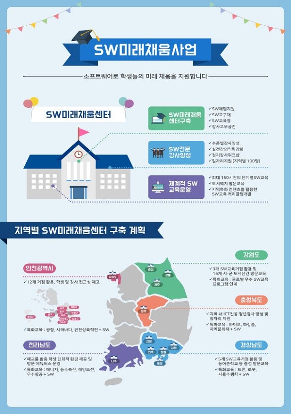 과기정통부에 따르면 5곳에 앞으로 3년간 총 35억원의 국비 지원과 자체 예산을 투입해 계획에 따라 올해 7월 센터를 구축하는 등 지역 내 SW교육 환경을 조성하게 된다.