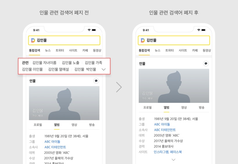 이제 다음과 카카오톡에서 인물을 검색하면 관련 검색어는 더이상 나타나지 않는다. 서제스트에는 대상 인물의 공식 프로필이나 정보성 키워드만 나타난다. 다음이 보유한 데이터베이스에 등재돼 있는 인물이 대상이며 데이터베이스는 지속적으로 업데이트된다.