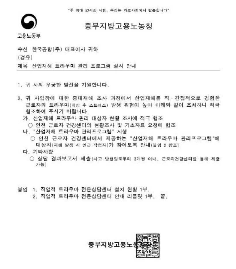 ▲고용노동부에서 산재사고와 관련해 한국공항에 보낸 공문.(출처=민주한국공항지부)
