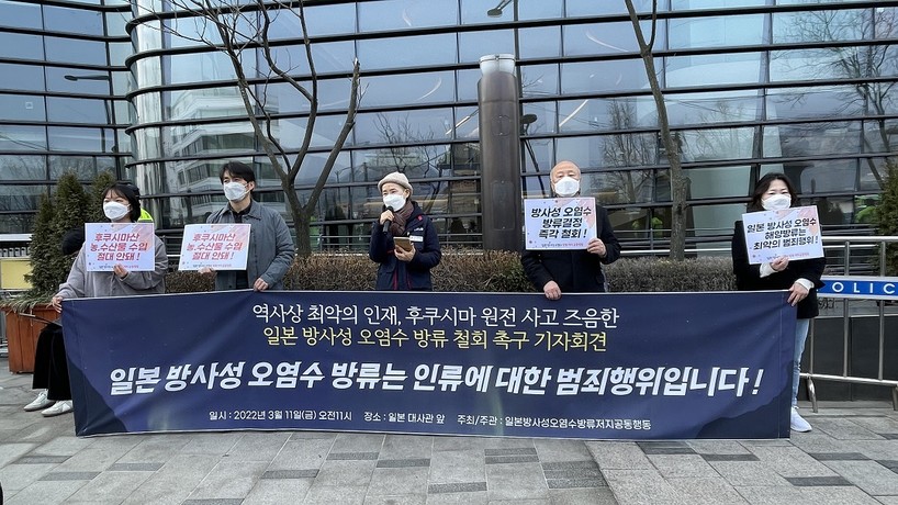각계 환경단체 및 시민사회단체가 연대한 '일본 방사성 오염수 방류저지 공동행동(이하 공동행동)'은 11일 오전 서울 종로구 주한 일본대사관 앞에서 기자회견을 열고 방사성 오염 물질 방류를 결정한 일본 정부를 규탄했다. 이들은 일본 후쿠시마 제1원자력 발전소 사고 11주기를 맞아 방사성 오염이 인체에 미치는 폐해를 강조하며 신임 정부가 외교 과정서 이를 단호히 대처해줄 것을 요구했다.