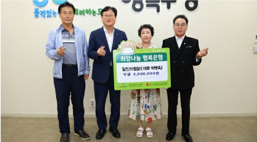 김대권 수성구청장은 “지역의 어려운 이웃을 위해 따뜻한 마음을 모아주셔서 감사드린다. 성금은 도움이 필요한 곳에 소중히 사용하겠다”고 말했다.