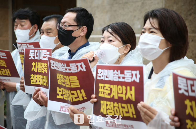 ▲마트산업노동조합 온라인배송지회는 15일 오전 11시 서울 중구 남대문로에 소재한 롯데쇼핑 본사 앞에서 기자회견을 열고 배송차량감축 및 일방적 계약해지 철회를 촉구했다.