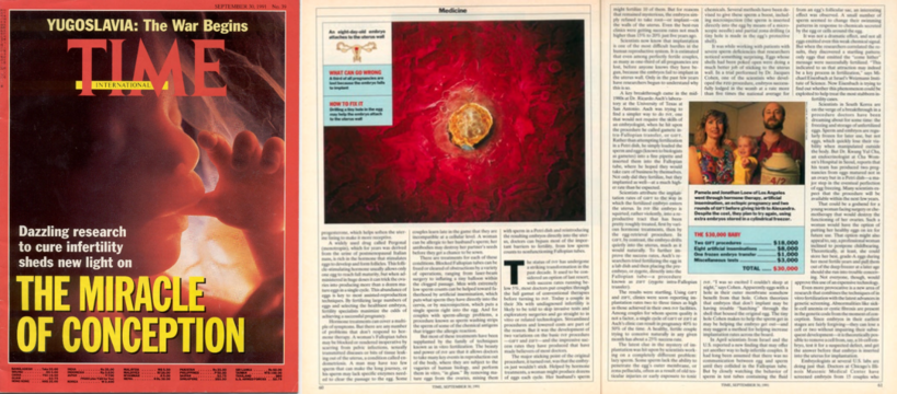 ▲1991년 TIME지에 게재된 차병원 IVM(미성숙난자의 체외 배양) 기술. 이 기술은 1989년 차광렬 연구소장팀이 세계 최초로 개발해 주목 받았다. (사진=차병원 제공) |
