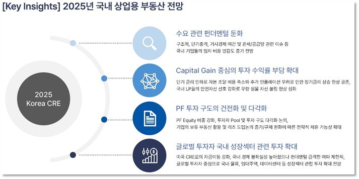 보고서는 또 2025년을 새로운 성장 동력을 준비하는 전환점으로 평가했다. 자산 양극화가 심화되면서 개별 물건의 효율화·차별화가 중요해질 것으로 예상했다. 특히 자산 가치에 대한 새로운 기준이 정립되는 가운데 임대주택·데이터센터·라이프사이언스 등 성장산업 연계 섹터 중심으로 투자 사이클이 재편될 것으로 전망했다.