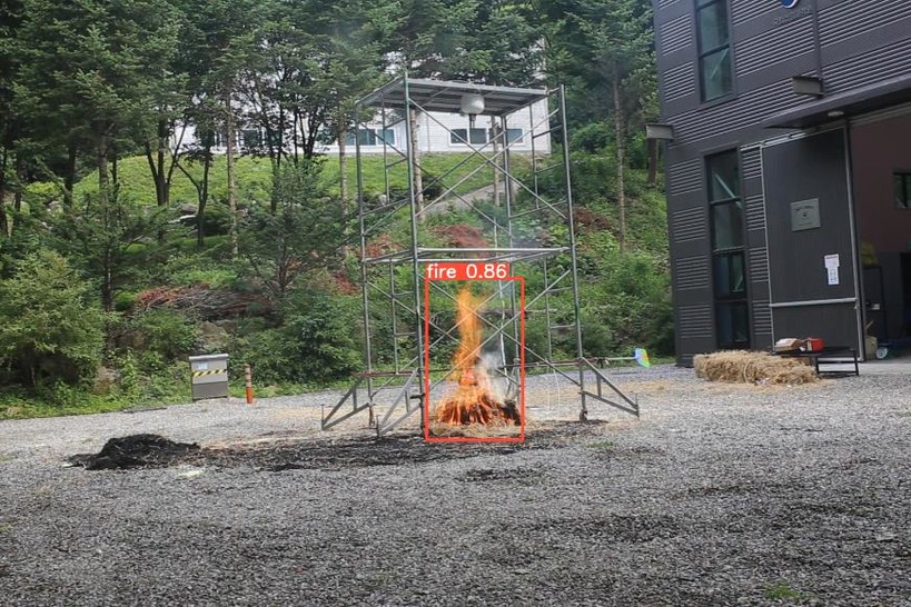▲ 모니터링 시스템에서 인식한 모의 화재(감시 대상을 빨간색 네모로 표시) (사진=한전) |