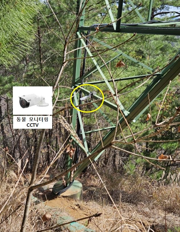 ▲ 시범철탑에 설치된 동물 모니터링용 cctv(노란색 원안쪽) 및 확대 이미지 (사진=한전) |