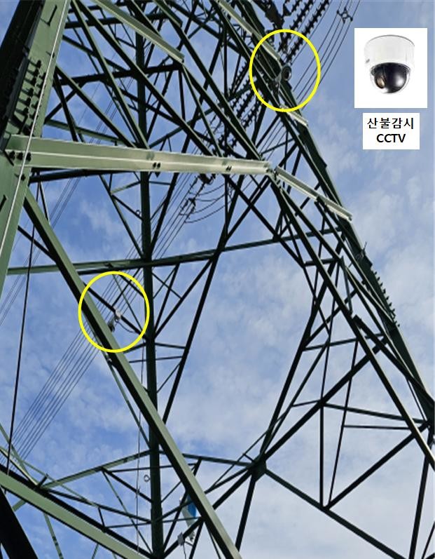 ▲ 시범철탑에 설치된 산불감시용 cctv(노란색 원안쪽) 및 확대 이미지 (사진=한전) |