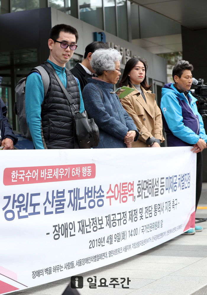 이들은 "장애인 특성에 맞지 않는 재난 상황의 고지, 수어 통역 미비 등의 문제는 재난 상황에서 장애인들의 재산은 물론 인명피해를 키울 수 있어 하루빨리 시정이 필요하다"면서 "재난방송에서의 수어 통역, 화면해설, 자막방송과 관련한 기준과 지침을 마련해야 한다"고 말했다.