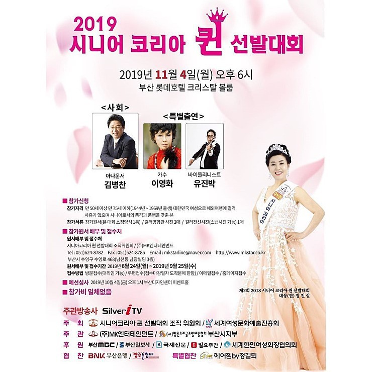 올해로 3회째를 맞는 이번 대회는 2019 제3회 시니어코리아 퀸 선발대회 조직위원회(위원장 김춘엽)와 세계여성문화예술진흥회(총재 전혜신)가 주최하고, MK엔터테인먼트(회장 김춘엽)가 주관한 가운데 〈일요주간〉, 부산MBC, 부산일보, 국제신문, 아시아공동체, 세계한인여성회장협의회 후원으로 개최됐다.