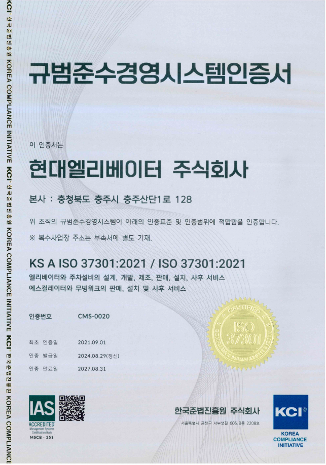 한편 현대엘리베이터는 ISO37301 이 외에도 1997년에는 기업의 환경경영 정책 활동을 평가하는 ISO14001(환경경영시스템), 2020년엔 사업장의 위험을 예방하고 관리해 안전한 근무 환경 조성을 위한 국제표준인 ISO45001(안전보건경영시스템) 등 다양한 국제표준인증을 획득하며 글로벌 리딩기업으로서의 입지를 공고히 해 나아가고 있다.
