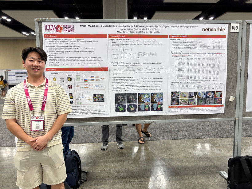 이외에도 넷마블은 2025 국제 컴퓨터 비전 학회의 사물 인식 워크숍에서 논문 'MUSE(Model-based Uncertainty-aware Similarity Estimation)’를 발표했다. 이번 논문을 통해 별도의 추가 학습 없이 원하는 객체를 인식하고 분할할 수 있는 혁신적인 AI 연구 성과를 선보이며 학회의 주목을 받았다.