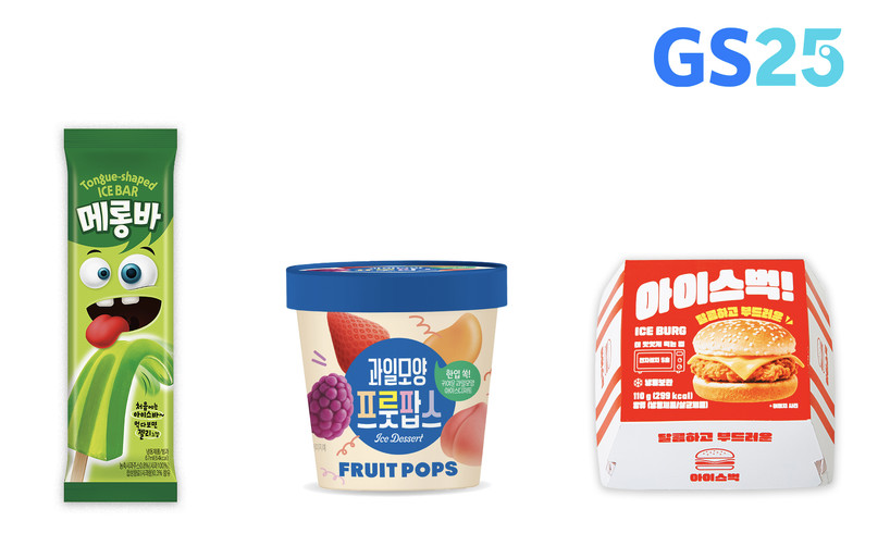 ▲ GS25에서 출시한 메롱바, 젼언니 과일모양프룻팝스, 아이스벅 상품(사진=GS25리테일)