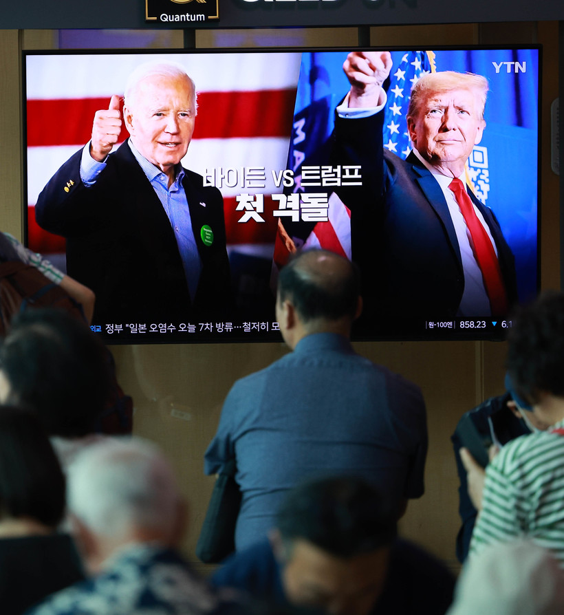 ▲ 지난 6월 28일 오전 서울역 대합실에서 시민들이 조 바이든 대통령과 도널드 트럼프 전 대통령의 2024 미국 대선 첫 번째 TV 토론회 생방송 화면을 시청하고 있다. (사진=newsis) |