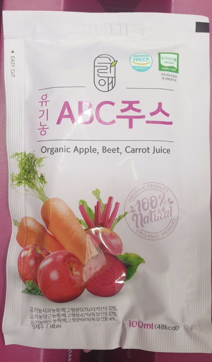 | ▲기준치를 초과한 세균이 검출된 유기농 ABC주스.(사진=식품의약품안전처 제공) |