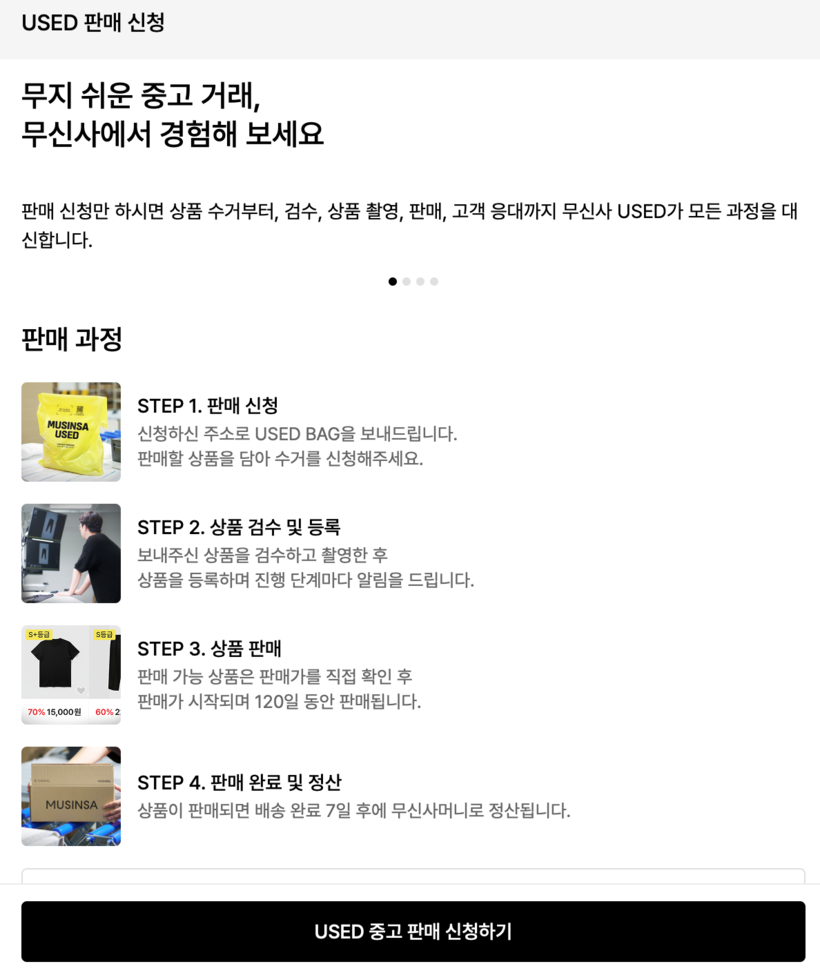 ◇ 검수 기반 중고 거래 서비스(이용자가 판매 상품을 보내면 무신사 검수센터에서 정품 여부, 브랜드 식별, 오염·손상 상태, 사용감 등을 확인한 뒤 판매 가능 여부를 결정)
