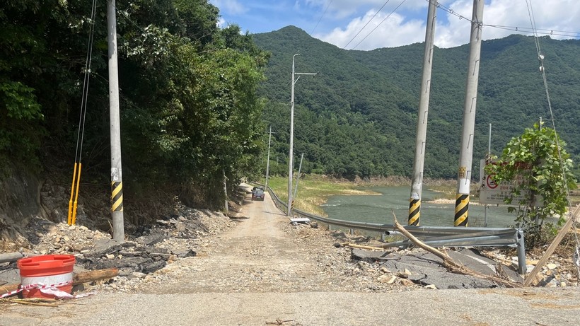 ▲ 폭우 피해가 발생한 청주시 조곡교 현황 <사진=도로교통공단> |