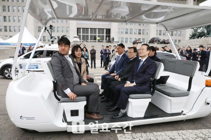 ▲ 서울 여의도 국회 본청 계단 앞에서 열린 자율주행기술·제품 전시 및 시승식 장면. |