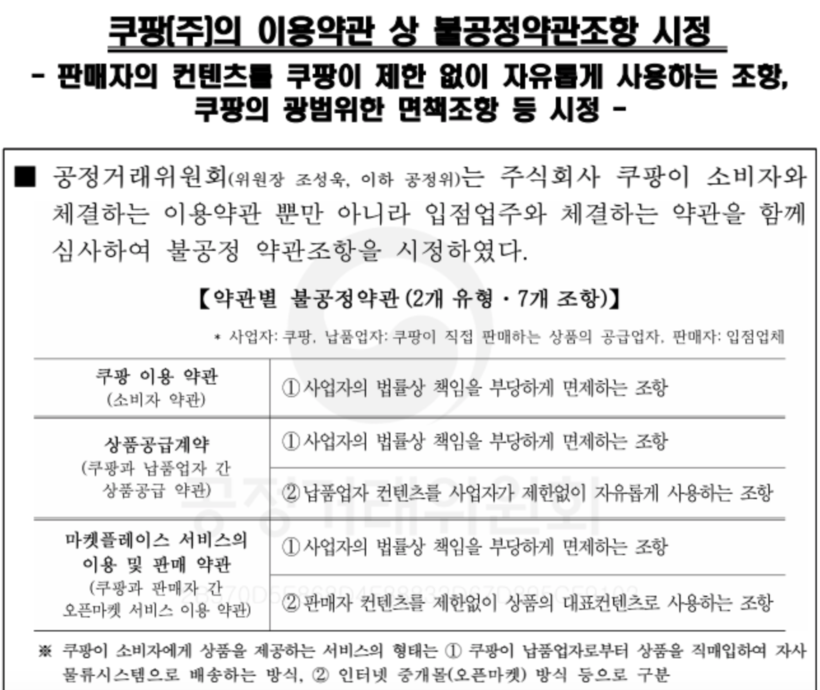 쿠팡은 판매자와 체결하는 약관에 ‘쿠팡이 판매자의 상호나 상품 이미지 등 컨텐츠를 자유롭게 사용하는 조항’을 두고 있으며, 해당 조항의 불공정성에 대한 문제가 제기돼 공정위가 나서 이를 심사했다.