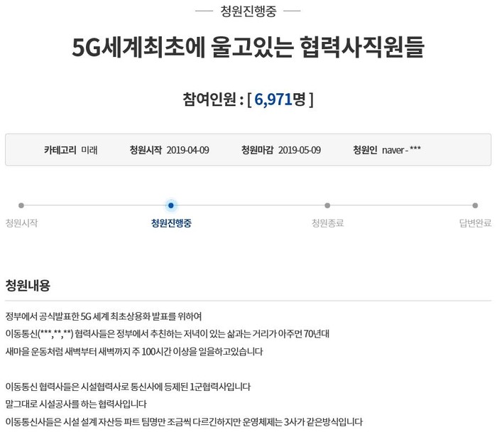 지난 9일 국민청원에 ‘5G 세계 최초에 울고 있는 협력사 직원들’이라는 제목의 글이 올라왔다. 청원자는 "국내 3사 이동통신사 협력사들은 정부에서 추진하는 저녁이 있는 삶과는 거리가 아주 먼 70년대 새마을 운동처럼 주100시간 이상을 일하고 있다"고 하소연했다.