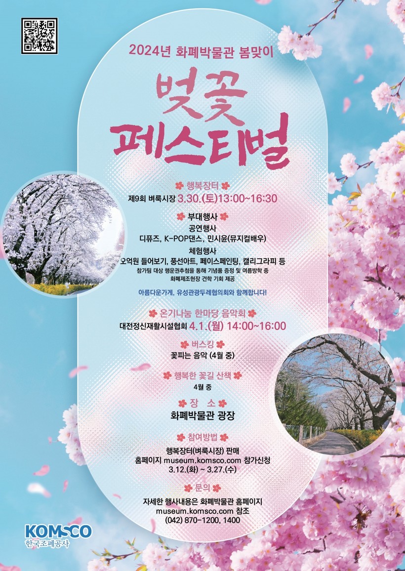 2024년 화폐박물관 봄맞이 ‘벚꽃 페스티벌’은 이달 30일 행복장터(벼룩시장)에 이어, 4월 1일에는 정신장애우를 위한 나눔 음악회 등 다양한 부대행사가 펼쳐질 예정이다.